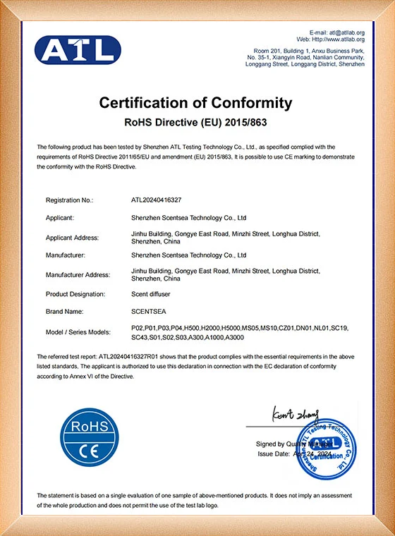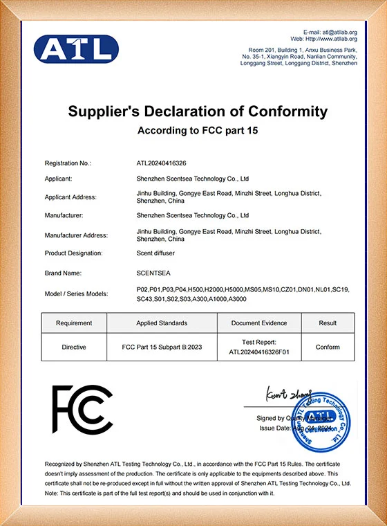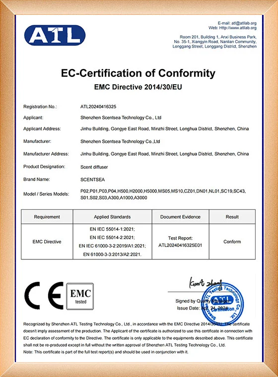 Tous les diffuseurs de parfum SCENTSEA sont certifiés CE, ROHS, FCC et SGS. Jusqu'à présent, les machines à parfums SCENTSEA ont été installées dans plus de 70 pays et largement appréciées par nos clients.